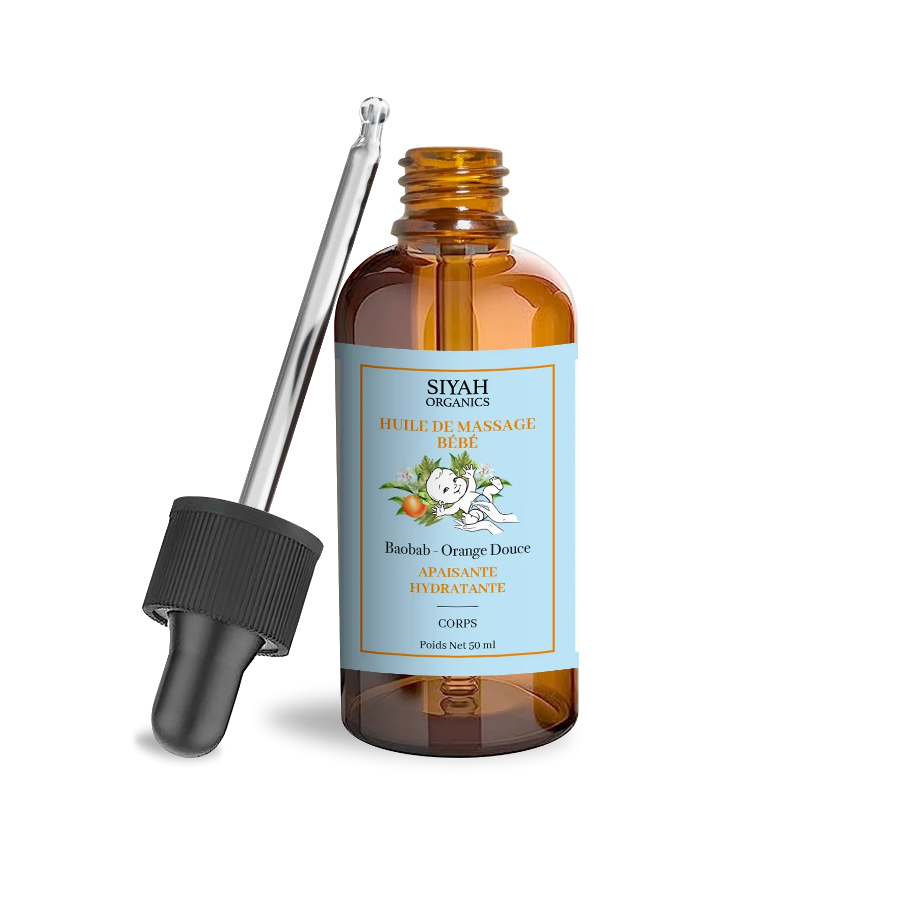 Mélange doux et nourrissant de Baobab et d'Orange Douce, cette huile de massage pour bébé hydrate la peau délicate tout en favorisant la relaxation.