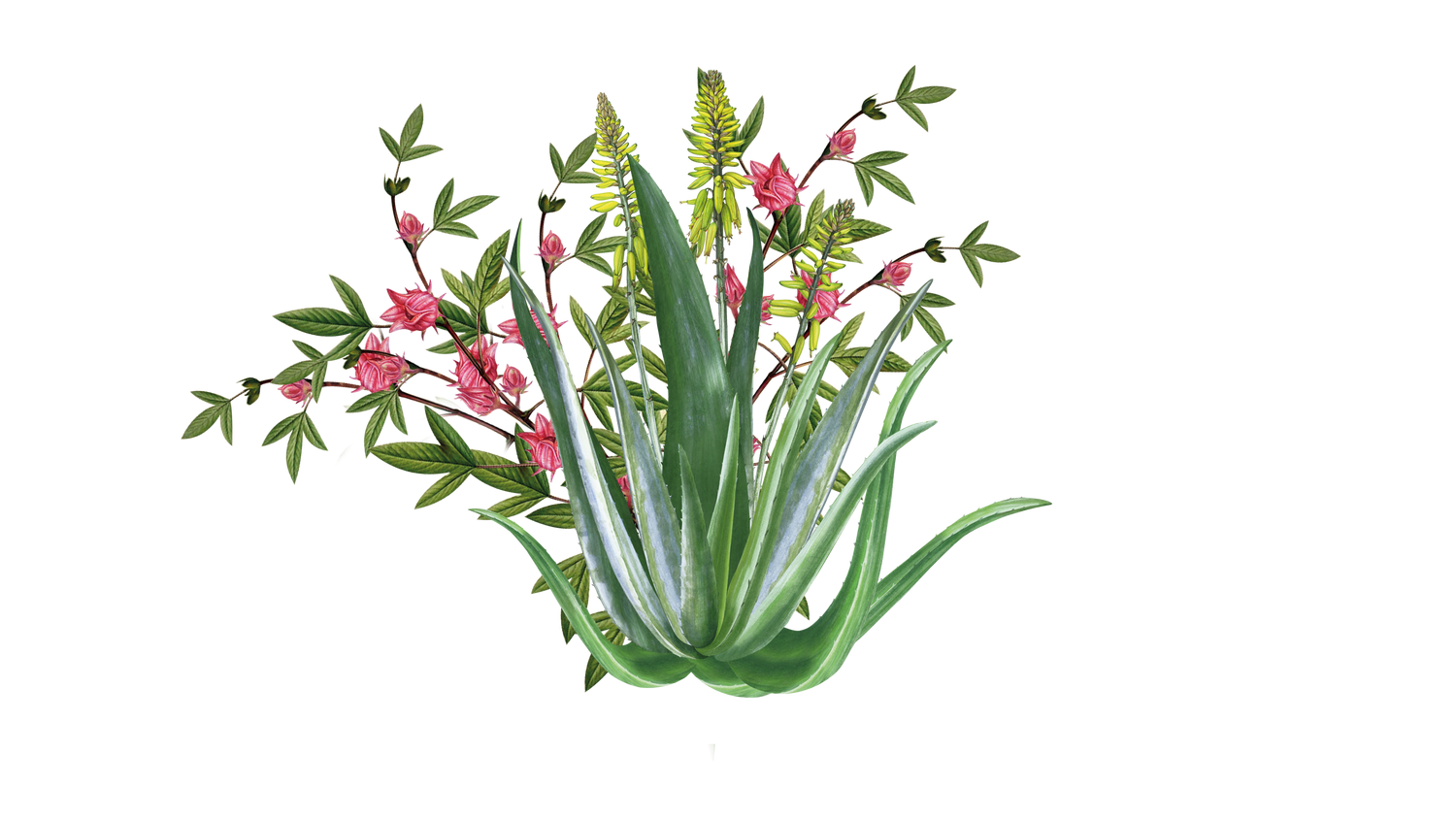 Beurre de Karité, Cire d'Abeille, Huile de Moringa Pressée à Froid, Huile de Bissap Pressée à Froid, Macérât Huileux avec Poudre de Bissap, Gel d'Aloe Vera, Vitamine E