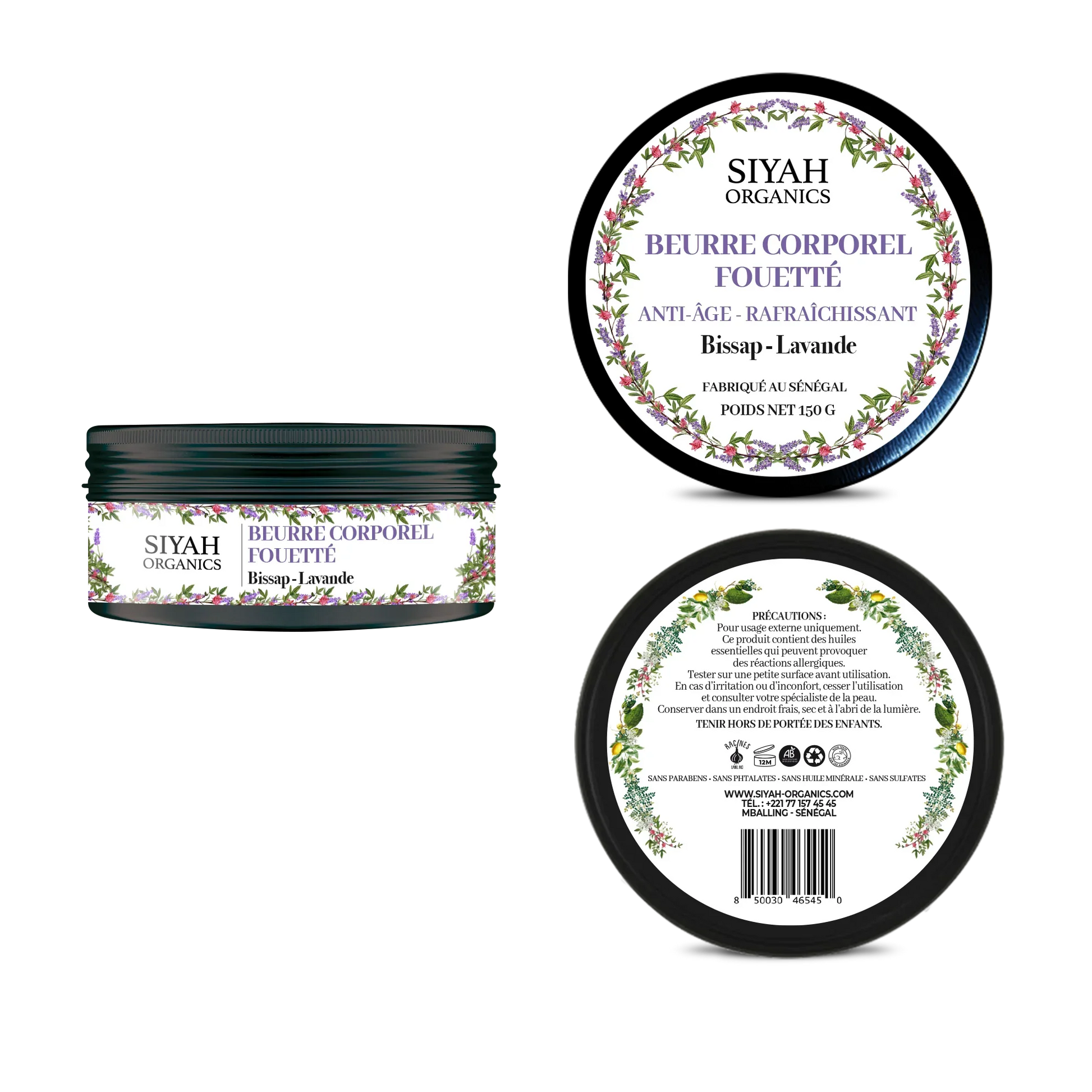 Bissap - Lavande : Beurre de Karité, Huile de Bissap Pressée à Froid, Poudre de Feuille de Bissap, Huile de Noix de Coco Pressée à Froid, Vitamine E, Huile Essentielle de Lavande.