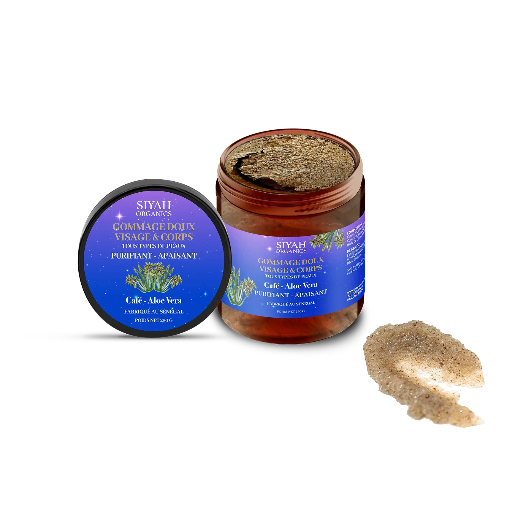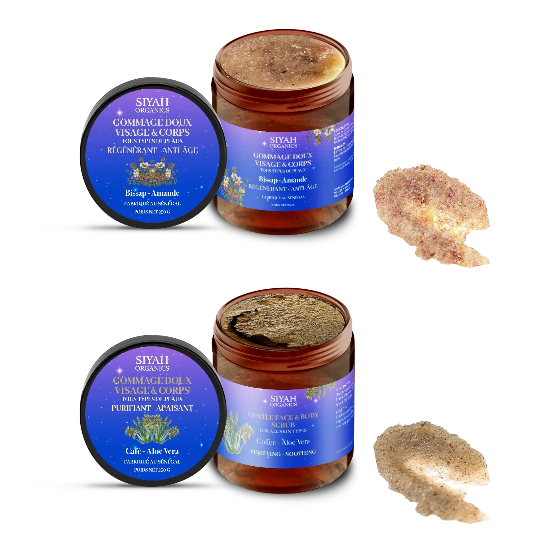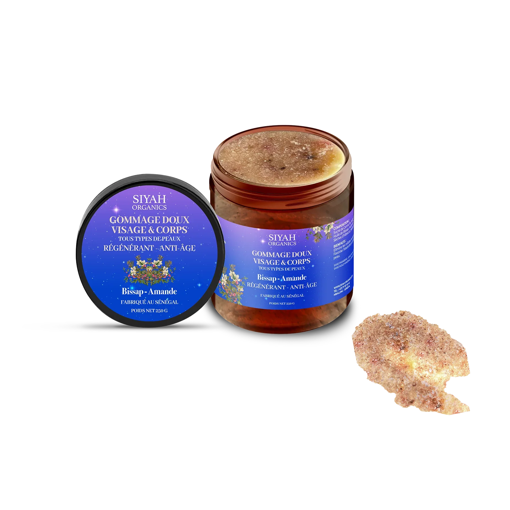 Révélez une peau éclatante et rafraîchie grâce à nos Gommages Doux Visage et Corps Bissap - Amande et Café - Aloe Vera. Ces mélanges nourrissants exfolient, adoucissent et illuminent laissant votre peau lisse et naturellement éclatante.