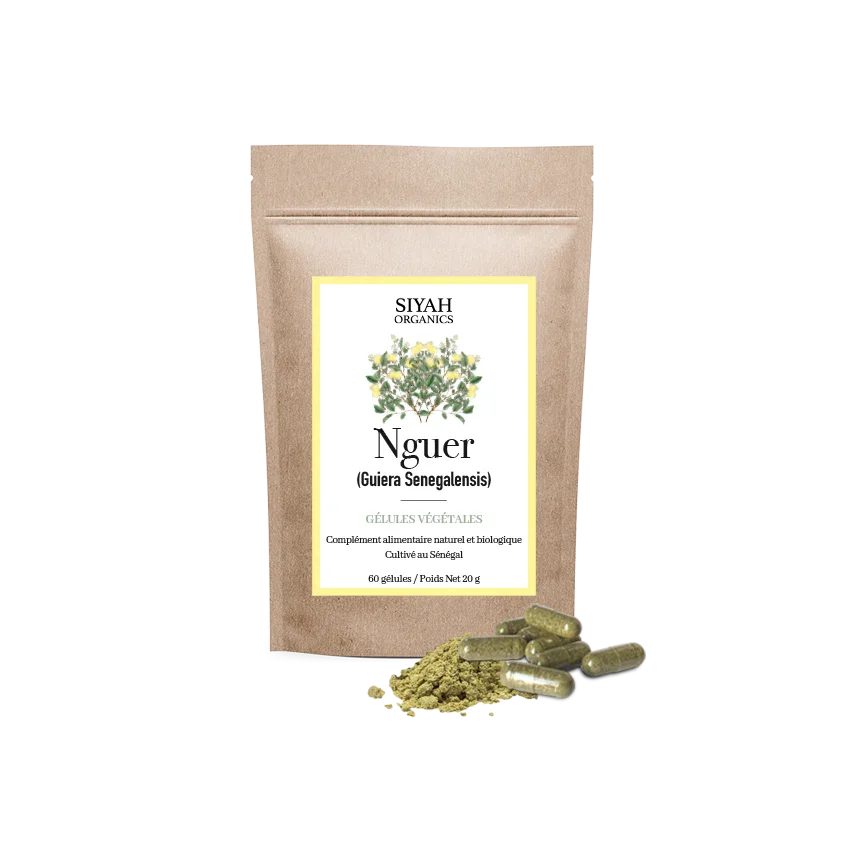 Le Nguer est connu pour ses propriétés fortifiantes et purifiantes. Traditionnellement appelé « Théier du Sénégal » il est utilisé pour favoriser la digestion et le bien-être général. Riche en composés naturels, il contribue à l'équilibre et à la vitalité.