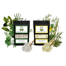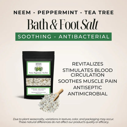 Neem - Peppermint - Tea Tree: Epsom Salt, Sea Salt, Neem Powder, Peppermint Essential Oil, Tea Tree Essential Oil, Neem Oil.