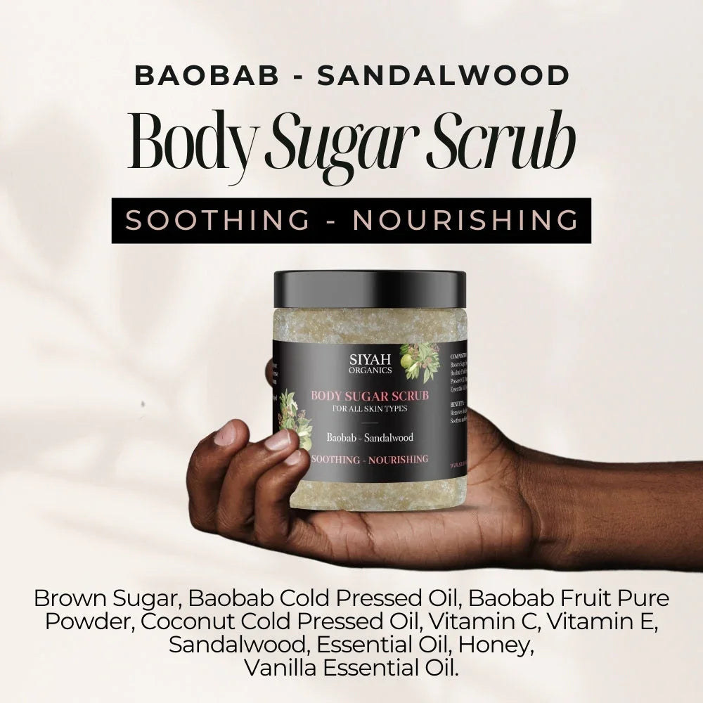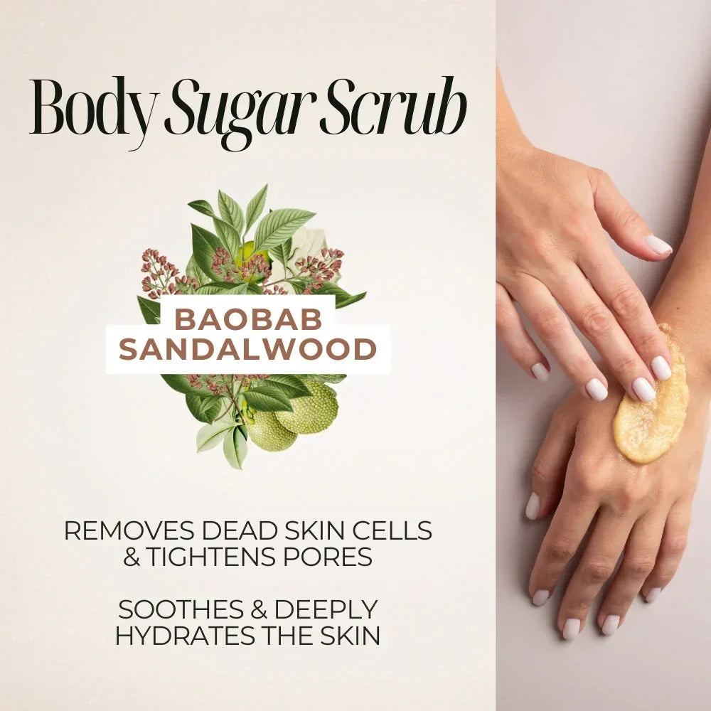 Baobab - Sandalwood: Brown Sugar, Baobab Cold Pressed Oil, Baobab Fruit Pure Powder, Coconut Cold Pressed Oil, Vitamin C, Vitamin E, Sandalwood Essential Oil, Honey, Vanilla Essential Oil.