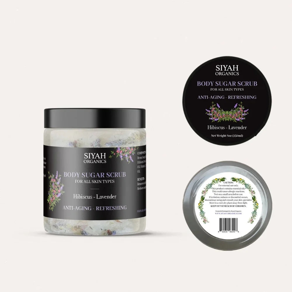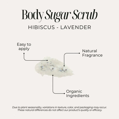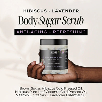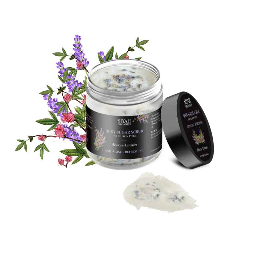 Hibiscus - Lavender: Brown Sugar, Hibiscus Cold Pressed Oil, Hibiscus Pure Leaf, Coconut Cold Pressed Oil, Vitamin C, Vitamin E, Lavender Essential Oil.