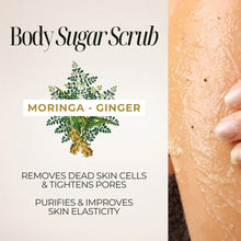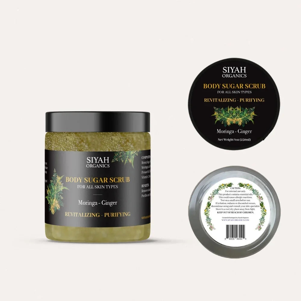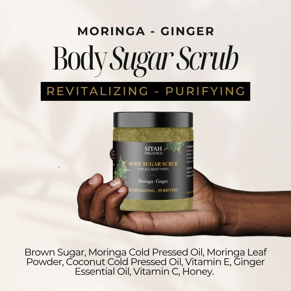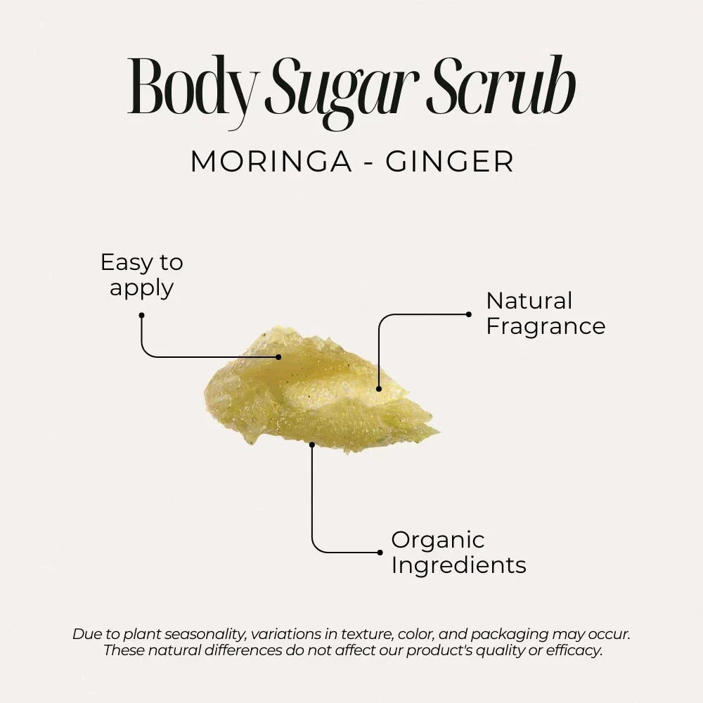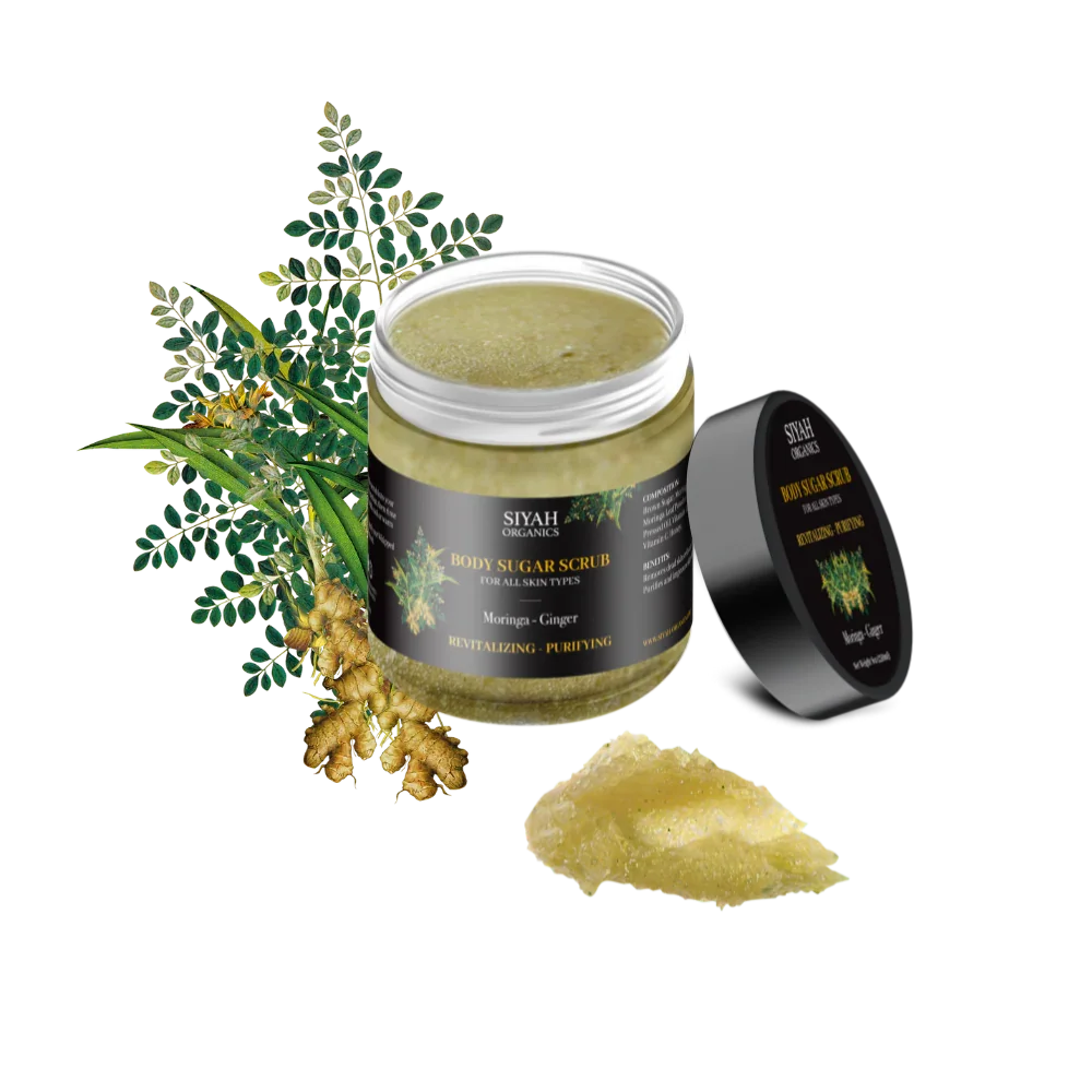 Moringa - Ginger: Brown Sugar, Moringa Cold Pressed Oil, Moringa Leaf Powder, Coconut Cold Pressed Oil, Vitamin E, Ginger Essential Oil, Vitamin C, Honey.
