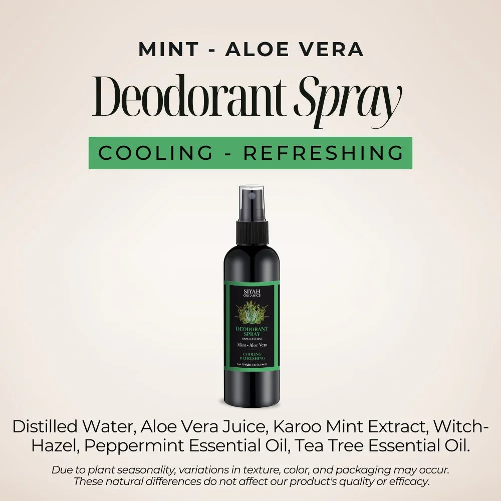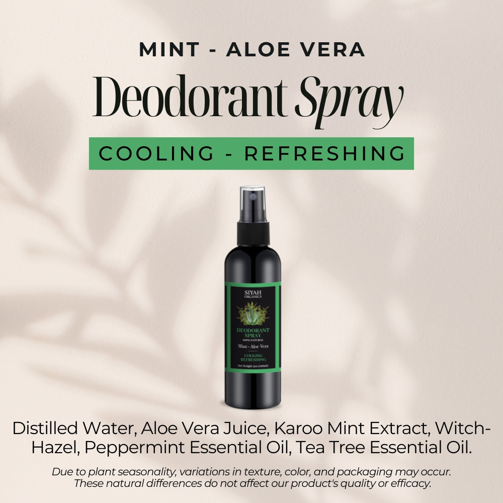 Mint - Aloe Vera: Distilled Water, Aloe Vera Juice, Karoo Mint Extract, Witch-Hazel, Peppermint Essential Oil, Tea Tree Essential Oil.