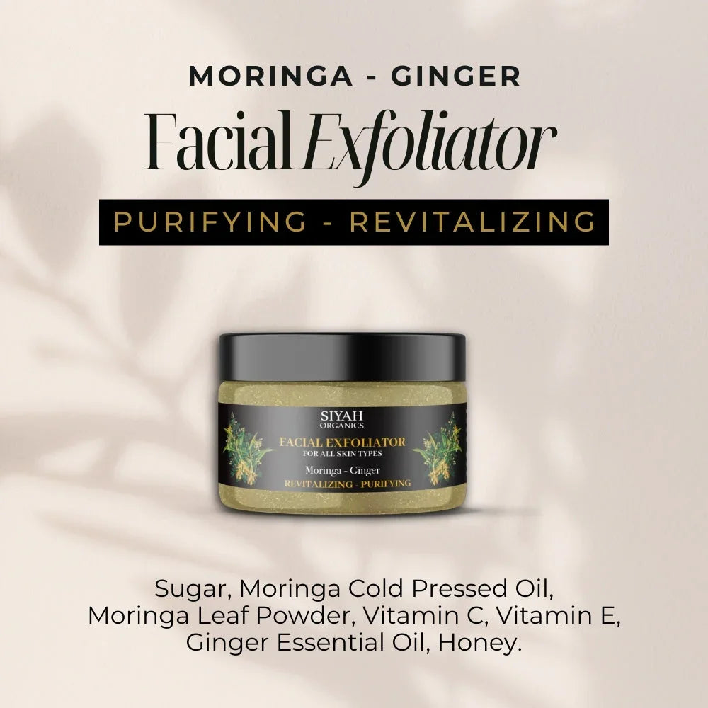 Moringa - Ginger: Sugar, Moringa Cold Pressed Oil, Moringa Leaf Powder, Vitamin C, Vitamin E, Ginger Essential Oil, Honey.